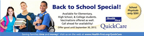 BREVARD COUNTY • ROCKLEDGE, FLORIDA — Health First QuickCare, a walk-in medical care clinic, is offering $30 back-to-school physicals for children and young adults (elementary through college ages).