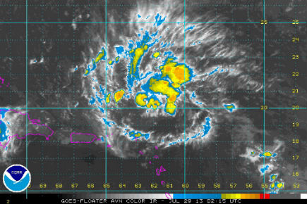 Here’s a infrared satellite image (measuring temperature) of the remnants northeast of the Leeward Islands earlier this evening.