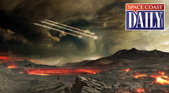 This is an artist’s concept of the young Earth being bombarded by asteroids. Scientists think these impacts could have delivered significant amounts of organic matter and water to Earth. (NASA.gov image)