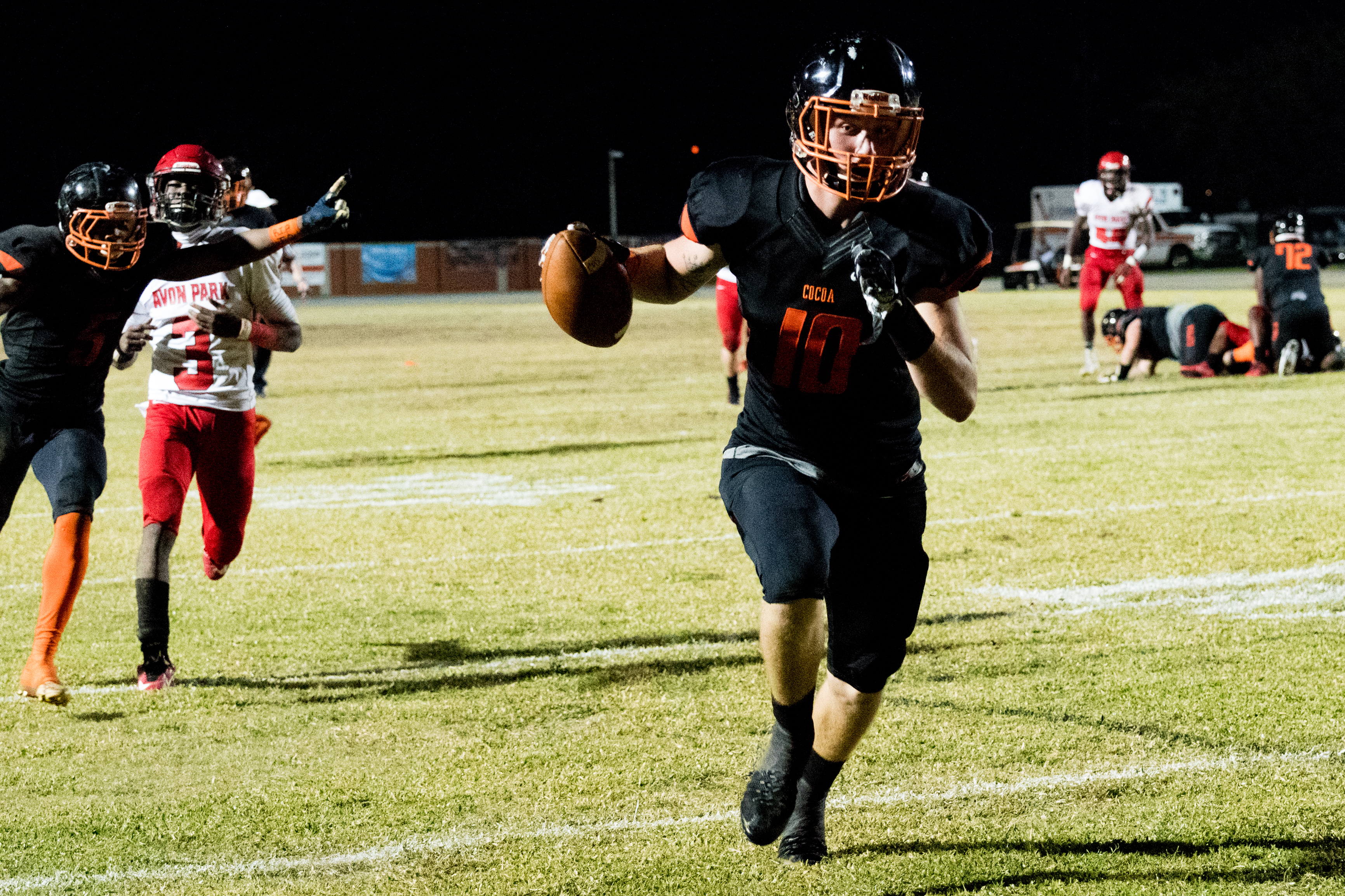 Cocoa RB Javian Hawkins leads the Tigers onto the field against Avon Park. (Colin Ziemer, SCD Image) CLICK IMAGE TO ENLARGECocoa Tigers walk to mid-field for the coin toss against Avon Park. (Colin Ziemer, SCD Image) CLICK IMAGE TO ENLARGECoin Toss between Avon Park and Cocoa. (Colin Ziemer, Space Coast Daily Image) CLICK IMAGE TO ENLARGECocoa’s Jaheim Mayes breaks free against Avon Park as Tigers win 63-7. (Colin Ziemer, SCD Image) CLICK IMAGE TO ENLARGECocoa Tigers and LB John Smith recover a bad snap by Avon Park for a touchdown. (Colin Ziemer, SCD Image) CLICK IMAGE TO ENLARGECocoa Tigers have outscored their last two opponents 126-15. (Colin Ziemer, SCD Image) CLICK IMAGE TO ENLARGECocoa QB Bradley Cantrell scrambles past Avon Park defenders. (Colin Ziemer, SCD Image) CLICK IMAGE TO ENLARGECocoa Tigers will face off with University next week after Cocoa defeated Avon Park 63-7 Friday night. (Colin Ziemer, SCD Image) CLICK IMAGE TO ENLARGECocoa RB Willie Gaines finding his stride in the postseason. Tigers beat Avon Park 63-7. (Colin Ziemer, SCD Image) CLICK IMAGE TO ENLARGECocoa RB Willie Gaines helps lead the Tigers to the State Semifinal against University next week. Cocoa beats Avon Park 63-7. (Colin Ziemer, SCD Image) CLICK IMAGE TO ENLARGECocoa Athlete Jordan Wojchichowski runs into the endzone. Tigers win 63-7. (Colin Ziemer, SCD Image) CLICK IMAGE TO ENLARGECocoa RB Willie Gaines runs by a defender. Cocoa advances to the State Semifinal. (Colin Ziemer, SCD Image) CLICK IMAGE TO ENLARGECocoa RB Willie Gaines sheds off a defender. Cocoa advances to the State Semifinal. (Colin Ziemer, SCD Image) CLICK IMAGE TO ENLARGETri-Marea Charles reels in a 43-yard touchdown catch from QB Bradley Cantrell. (Colin Ziemer, SCD Image) CLICK IMAGE TO ENLARGE