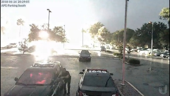 ABOVE VIDEO: An Apopka Police Officer was loading up his vehicle earlier this week and got quite a shock when lightning struck in the parking lot behind him. (Surveillance video released by the Apopka Police Department)
