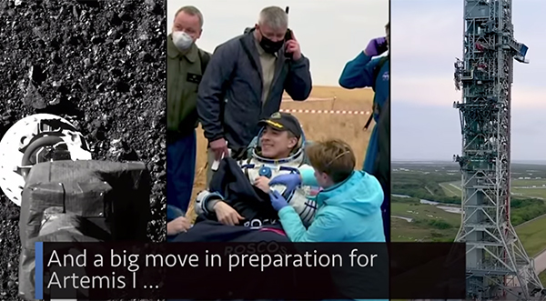 ABOVE VIDEO: A touch of history for our first asteroid sample return mission, a safe return from the International Space Station, and a big move in preparation for Artemis I … a few of the stories to tell you about – This Week at NASA!