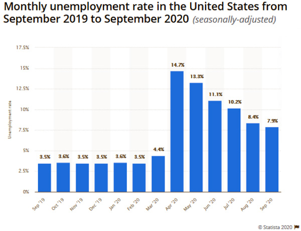 In fact, the unemployment rate in the USA was about 3.58 percent in 2019, according to Statista.com. And now it is twice as high as last year.
