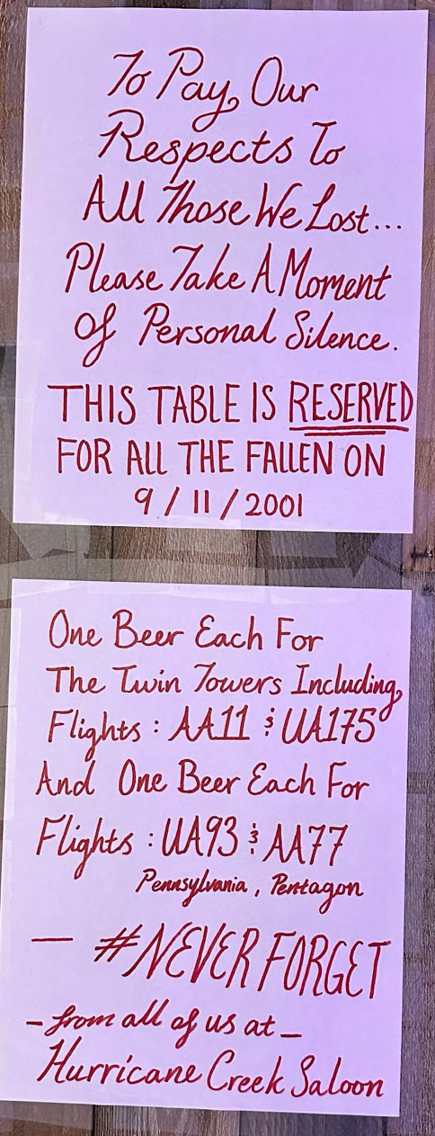 Honoring First Responders and Veterans Hurricane Creek Saloon has always been more than just a venue for great music and food—it’s a hub of local pride and community service. By taking the time to commemorate 9/11, they remind locals and visitors alike of the importance of remembering not just the tragedy but also the bravery of the first responders, veterans, and all who risked their lives on that day. The American flag hung across the saloon only adds to the atmosphere of respect, grounding the saloon in a strong sense of patriotism.