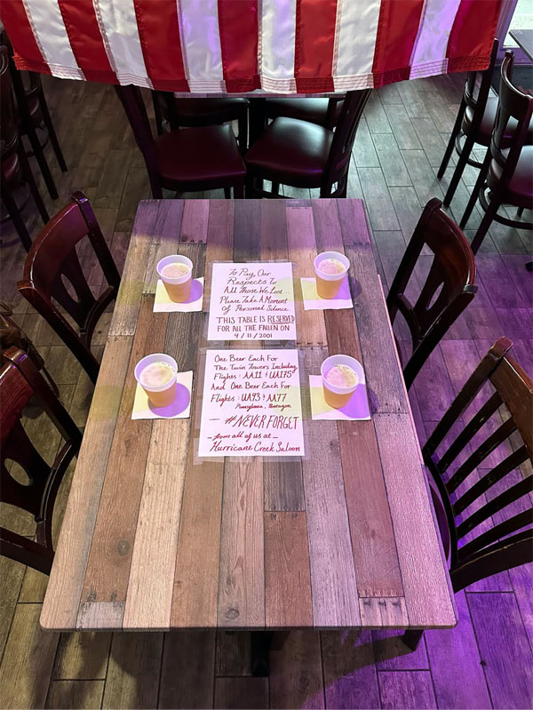 Accompanied by handwritten signs, the display asks patrons to take a moment of personal silence to pay their respects. Each beer on the table represents one of the four flights that were tragically hijacked—American Airlines Flight 11, United Airlines Flight 175, United Airlines Flight 93, and American Airlines Flight 77.