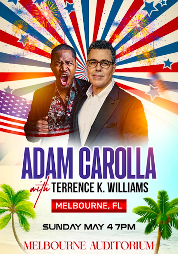 BREVARD COUNTY, FLORIDA – Comedy superstars Adam Carolla and Terrence K. Williams are teaming up at Melbourne Auditorium on Sunday, May 4, for a night of raw, unfiltered, and downright hilarious stand-up that you won’t forget. Get your tickets HERE.