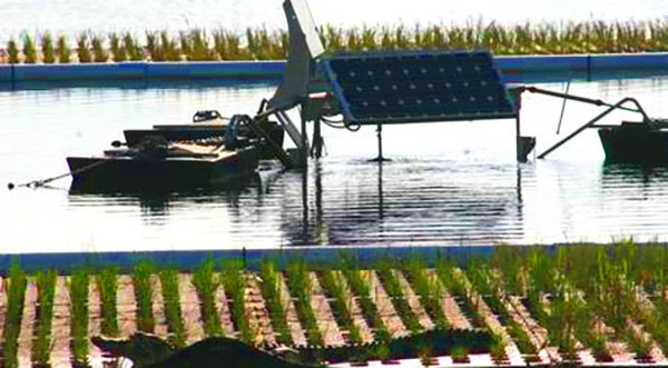 The study aimed to determine the effectiveness of vertical water circulation on nutrient uptake in plants grown on floating wetlands. These floating wetlands, covering 16,727 square feet—or about 5% of the pond’s surface—were installed at both ends of the pond.