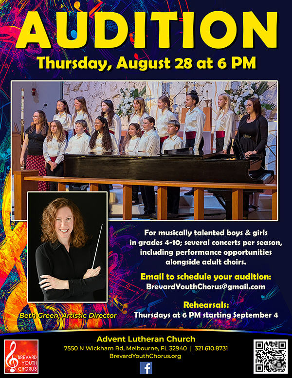 BREVARD COUNTY • SUNTREE, FLORIDA — The Brevard Youth Chorus will hold auditions for singers in grades 4-10 on Thursday, August 28 at 6 p.m. at Advent Lutheran Church in Suntree, 7550 N. Wickham Road.