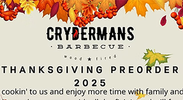 Orders are now open for the all-inclusive Thanksgiving package, which feeds six to eight people and includes a full selection of smoked holiday favorites prepared in true Cryderman’s style.