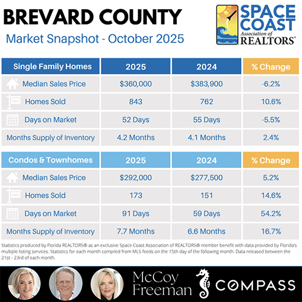 WATCH: Bobby and Nikki McCoy Freeman — trusted Space Coast real estate experts and leaders of the McCoy Freeman Group at Compass | Carpenter Kessel Team — break down the October 2025 housing trends shaping Cocoa Beach, Cape Canaveral, Merritt Island, Viera, Satellite Beach, and surrounding communities.