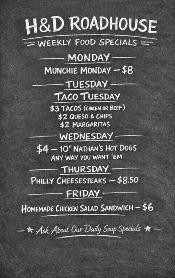 The weekly lineup wraps up on Friday with a homemade chicken salad sandwich offered for six dollars. In addition to the daily specials, H&D Roadhouse encourages guests to ask about its rotating daily soup selections.