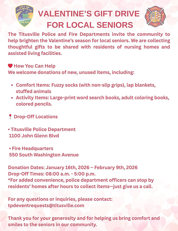 BREVARD COUNTY • TITUSVILLE, FLORIDA – The Titusville Police Department and Titusville Fire Department have announced a communitywide Valentine’s Day donation drive aimed at bringing comfort and joy to seniors living in local nursing homes and assisted living facilities.