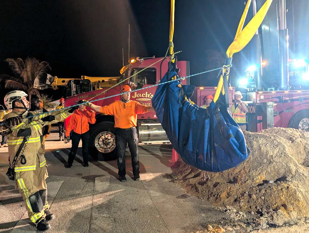 The response included the Brevard County Fire Rescue Stations 48 and 64, Indialantic Fire Rescue, Melbourne Beach Fire Department, University of Florida’s Veterinary Emergency Treatment Services, Florida Fish and Wildlife Conservation Commission (FWC), Brevard County Public Works, and Jack’s Wrecker Service.