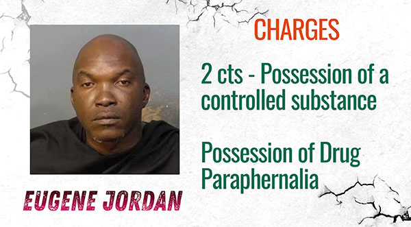Eugene Jordan was arrested and charged with two counts of possession of a controlled substance and possession of drug paraphernalia.