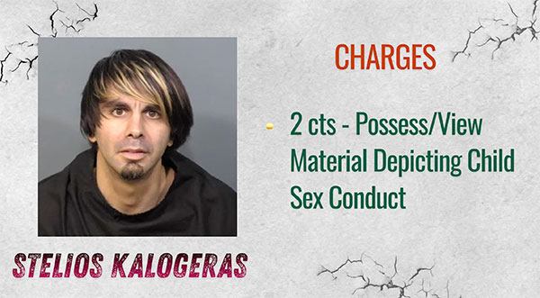 Stelios Kalogeras was taken into custody on two counts of possession and viewing of material depicting child sexual conduct. The charges stem from an investigation conducted by the Sheriff’s Office. Officials emphasized their continued commitment to aggressively pursuing crimes involving the exploitation of children.