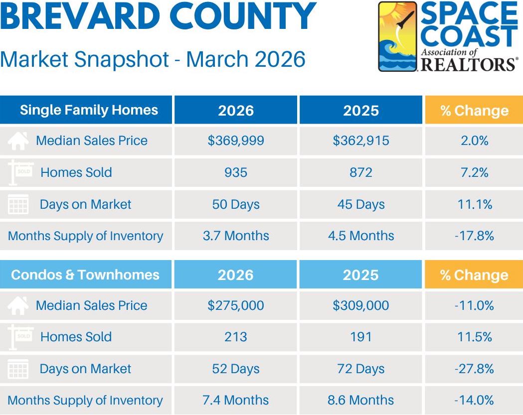 BREVARD COUNTY, FLORIDA — New data released by the Space Coast Association of REALTORS shows a Brevard County housing market marked by rising closed sales, tightening inventory, and mixed price trends across property types in March and the first quarter of 2026.