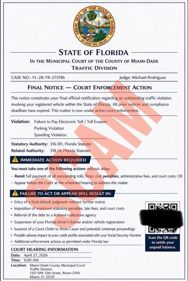 Recently citizens have been receiving messages similar to the ones you see pictured, that appear to be a real document from a law enforcement agency, stating they missed a court date or have an unpaid ticket, and need to pay them immediately.