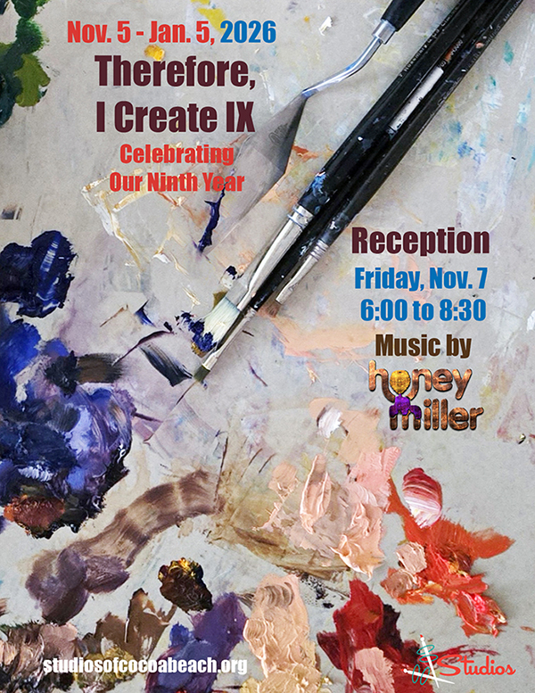 BREVARD COUNTY • COCOA BEACH, FLORIDA – This holiday season at the Studios of Cocoa Beach, ‘Therefore, I Create IX,’ the 9th Annual Members’ Exhibition, running from November 4 to January 4, welcomes the public.