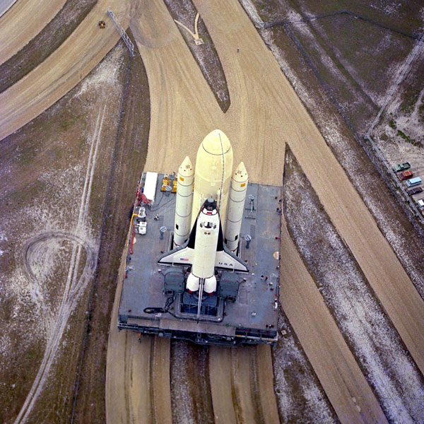 BREVARD COUNTY, FLORIDA – Preparations for the inaugural flight of space shuttle Columbia passed a major milestone at NASA’s Kennedy Space Center on Dec. 29, 1980, with the rollout of the vehicle stack from the Vehicle Assembly Building (VAB) to its seaside Launch Pad 39A.
