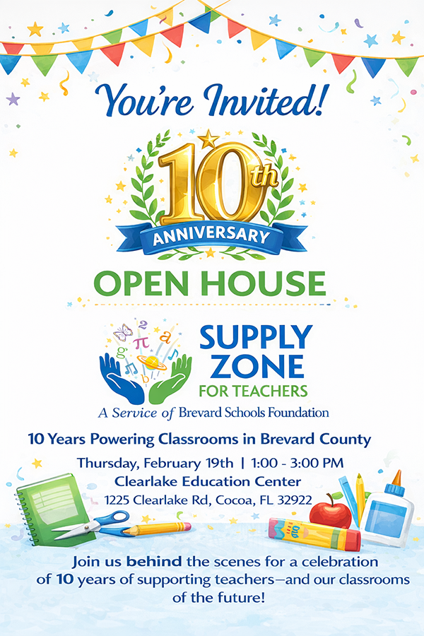 BREVARD COUNTY • COCOA, FLORIDA –The Supply Zone for Teachers, a service of the Brevard Schools Foundation, will celebrate a decade of supporting local educators with a 10th Anniversary Open House on Thursday, February 19, from 1 – 3 p.m. at the Clearlake Education Center in Cocoa.