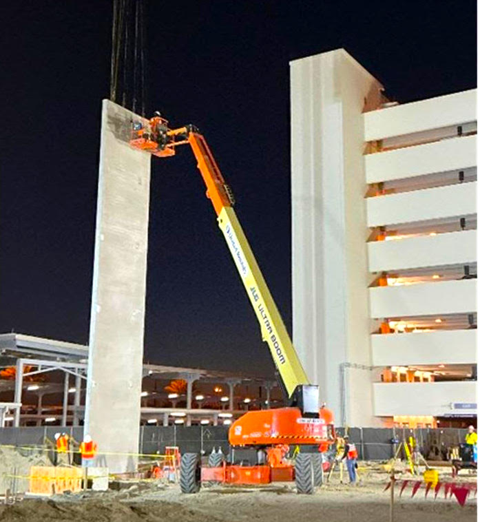 BREVARD COUNTY • PORT ANAVERAL, FLORIDA – A new 3,732-space Cruise Terminal 6 East (CT6E) parking garage at Port Canaveral reached a significant milestone when a massive 600-square-foot, 36.7-ton pre-cast concrete wall section was recently lowered into place, marking the beginning of the vertical construction of the 13-story facility.