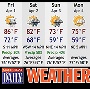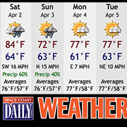 Sunny. Highs in the lower 80s. West winds 5 to 10 mph increasing to 10 to 15 mph in the afternoon. […]