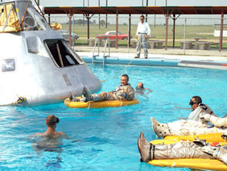 In this June 1966 photo, the Apollo 1 crew practices water egress procedures with a full-scale boilerplate model of the spacecraft. In the water at the right are astronauts Ed White and Roger Chaffee. […]